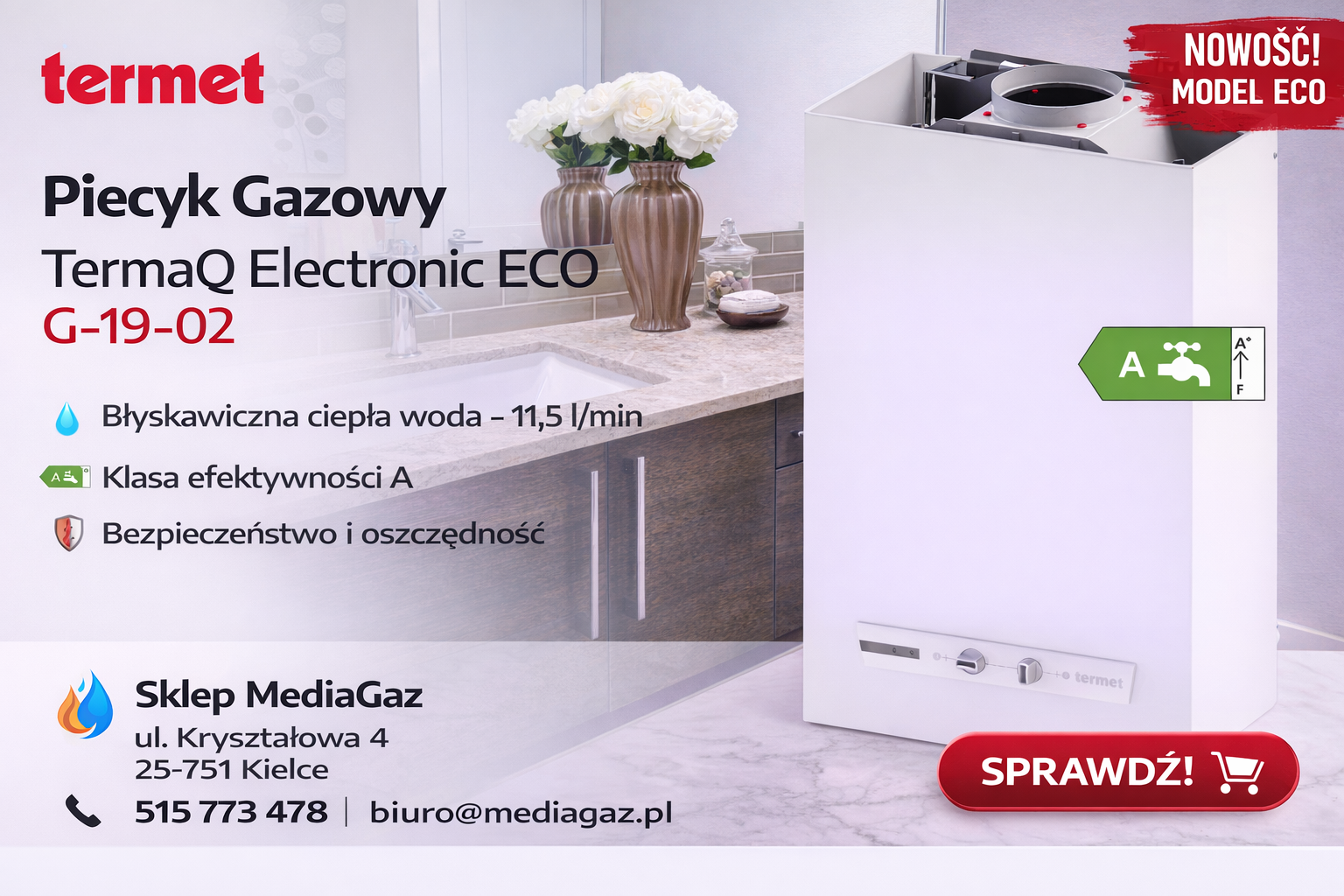 🔥 Piecyk Gazowy Termet TermaQ Electronic ECO G-19-02 (Gaz Ziemny GZ20) + MONTAŻ W KIELCACH
